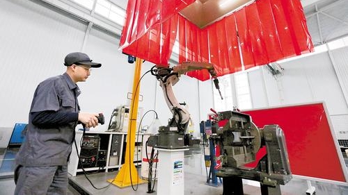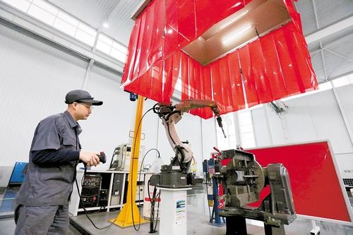 近日,在唐山百川机器人共享工厂,工作人员正调试机器人焊接工作站。记者 王育民 摄