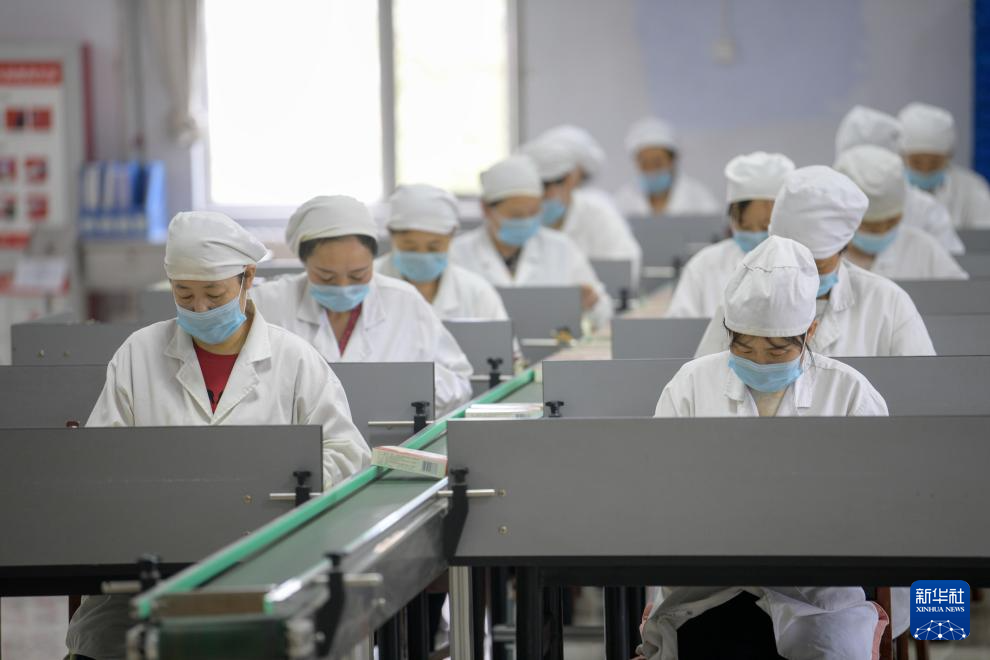 6月29日,在围场县一家药业公司,工人在金莲花颗粒产品包装车间作业。