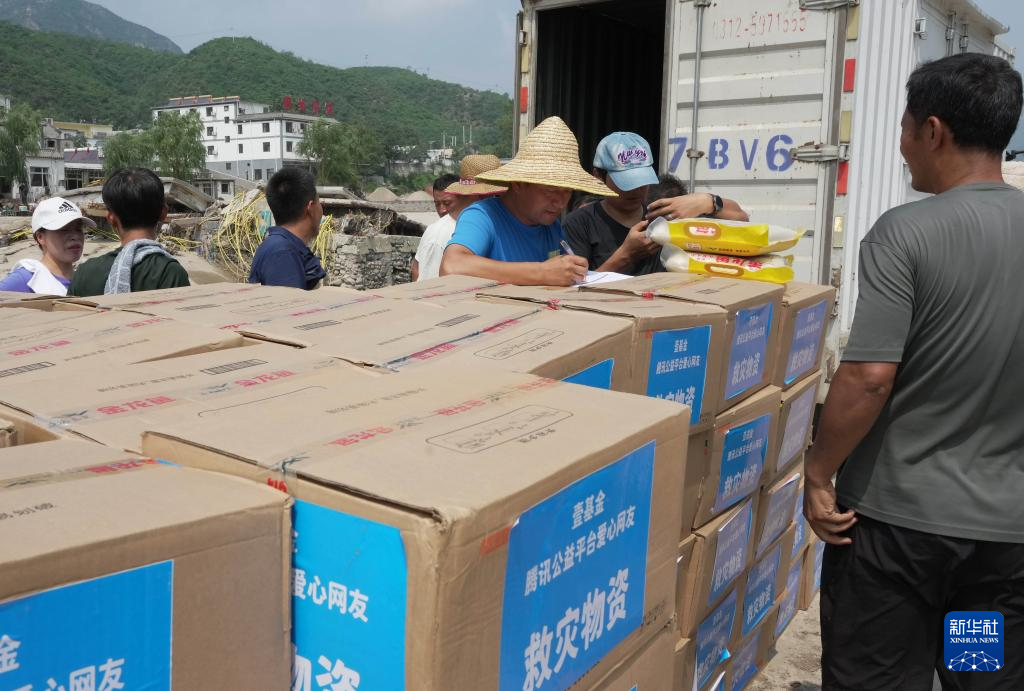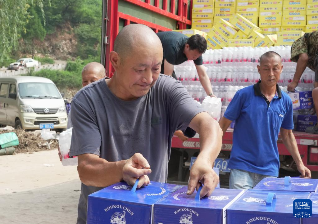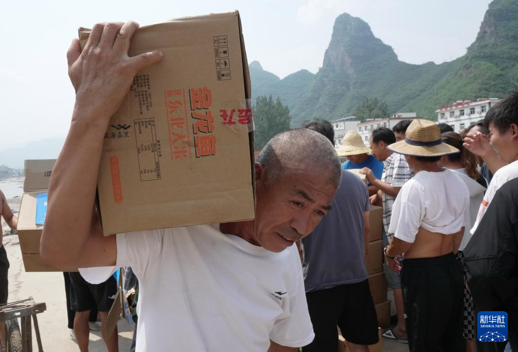 8月10日,在涞水县龙门乡,村民将捐赠的食品和饮用水卸车。