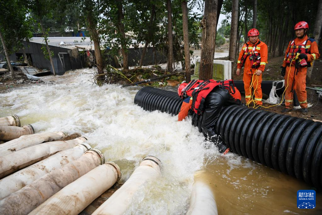 8月6日,在河北省涿州市刁窝镇东张村,唐山消防救援支队队员正在进行排涝作业。新华社记者 牟宇 摄