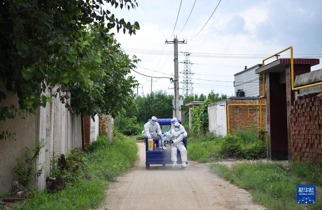 8月6日,在河北省涿州市刁窝镇白塔村,防疫人员在进行道路消杀作业。新华社记者 牟宇 摄