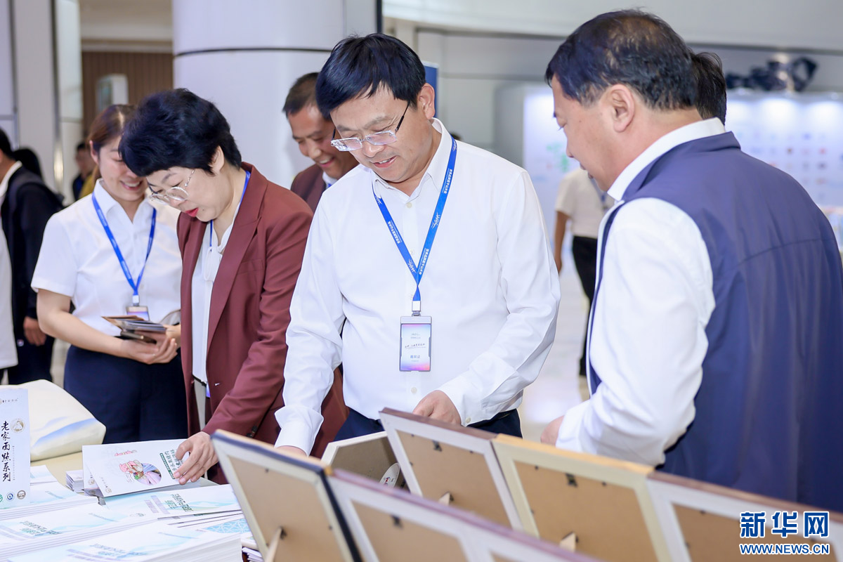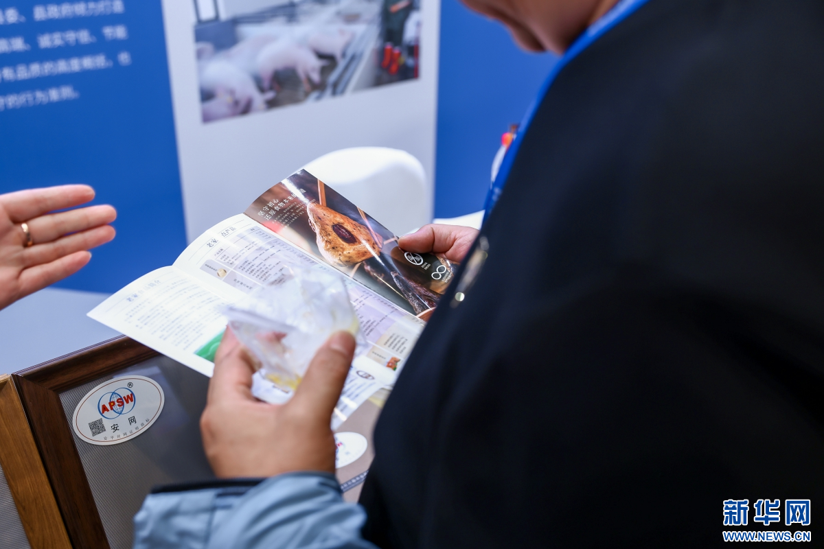 参会嘉宾在展区前翻阅企业宣传册。新华网发