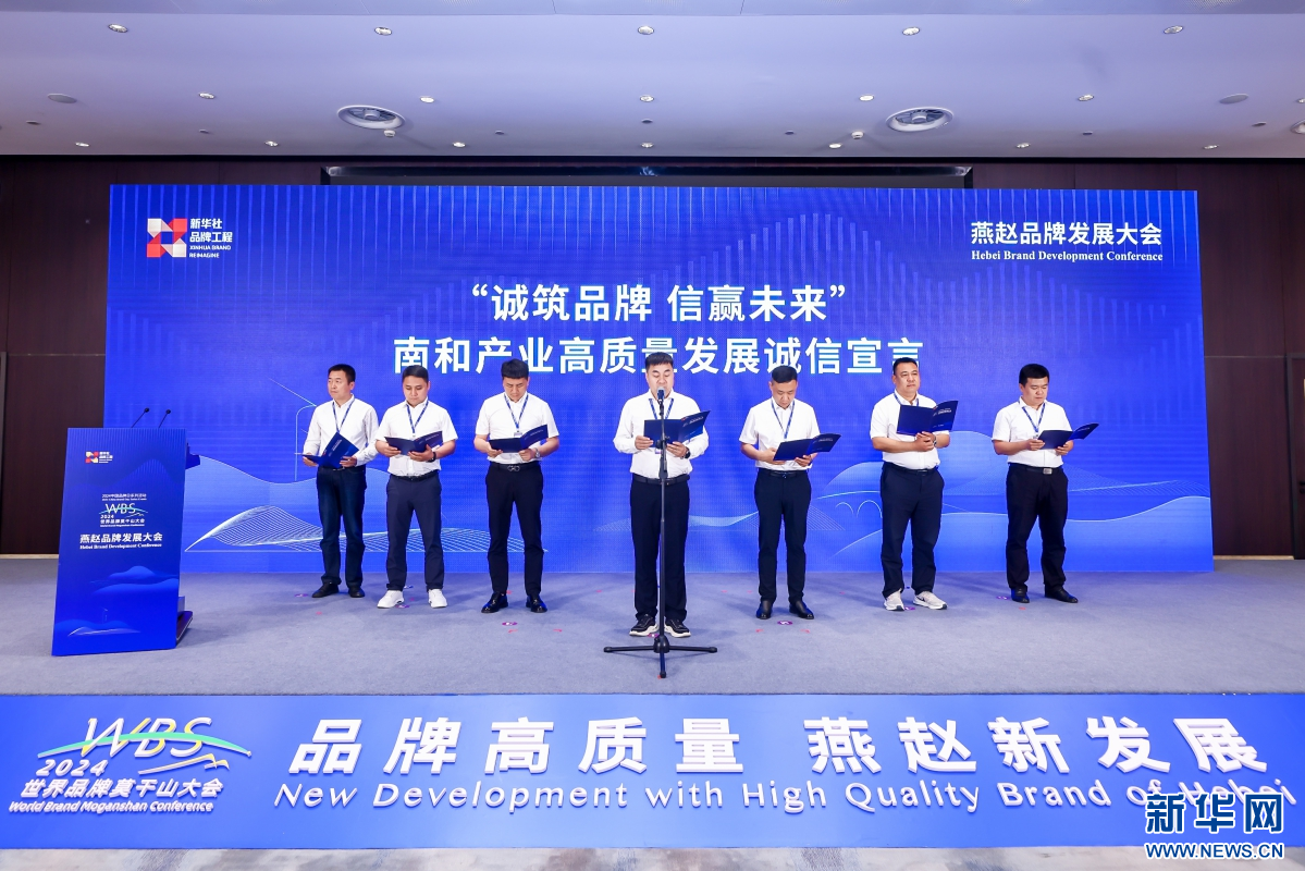邢台市南和区电商商会会长宁龙飞及南和区六家企业代表发布“诚筑品牌 信赢未来”南和产业高质量发展诚信宣言。新华网发