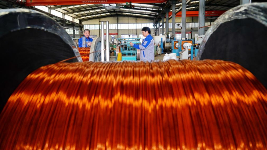 10月25日,河北省河间市常丰线缆有限公司工人在车间内检查产品质量。