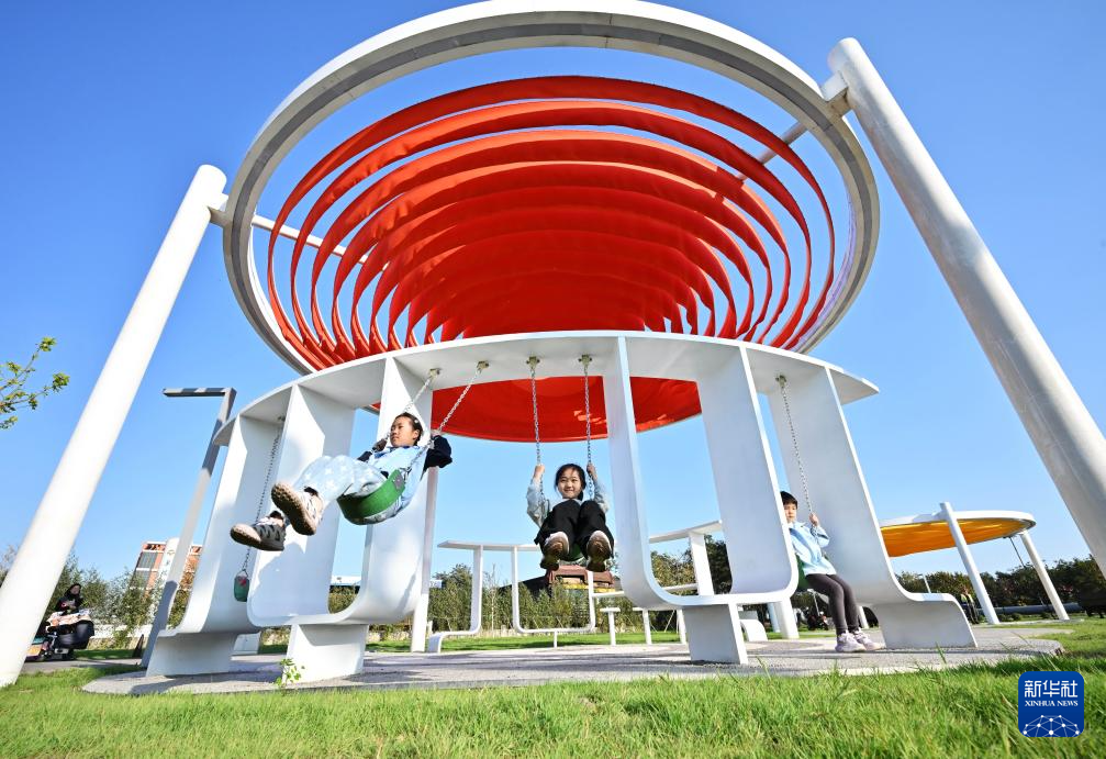 10月15日,小朋友在唐山市海港经济开发区涟漪广场荡秋千。