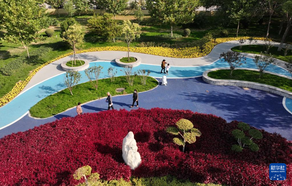 10月15日,市民在唐山市海港经济开发区一处街角公园休闲锻炼(无人机照片)。