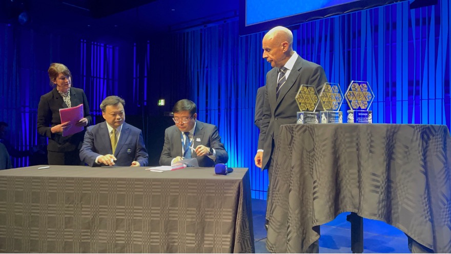 会上,国际雪联主席约翰·埃利亚施、秘书长米歇尔·韦恩与国家体育总局冬季运动管理中心主任王磊、张家口市人民政府副市长刘海峰签订了办赛协议。埃利亚施向张家口市颁发2029年国际雪联单板滑雪和自由式滑雪世锦赛举办城市牌匾,王磊、河北省体育局局长王彪、刘海峰共同接牌。
