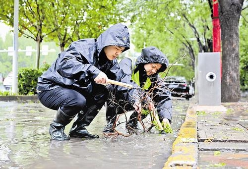 8月26日,石家庄市裕华区城市管理综合行政执法局工作人员在雨中清理路面杂物。记者 史晟全 摄