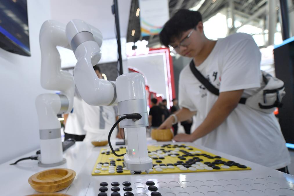 9月6日,参观者在本届数博会上体验与5g智能机器人下围棋。新华社记者 骆学峰 摄