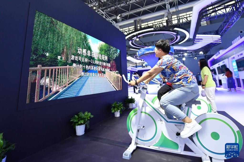 9月7日,参观者在本届数博会上体验能量单车。新华社记者 骆学峰 摄