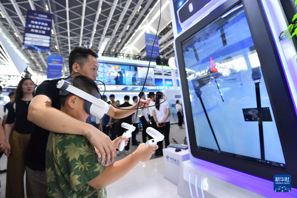 9月6日,在本届数博会上,工作人员指导小朋友体验vr技术。新华社记者 骆学峰 摄