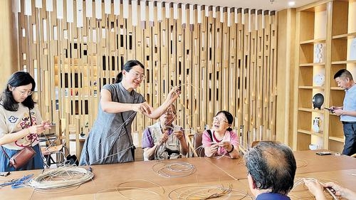 日前,秦皇岛市北戴河区东山街道办事处东山社区邀请北戴河区非物质文化遗产传承人赵珠好(左二)到燕山院传授手缕编技艺。本报通讯员 鞠然 摄