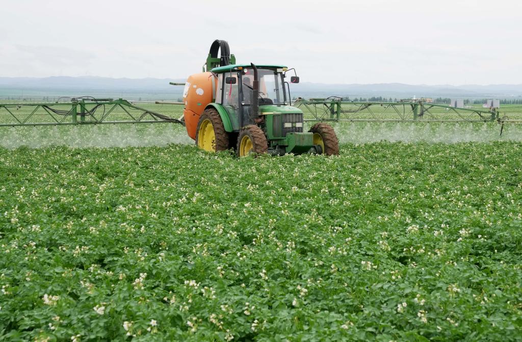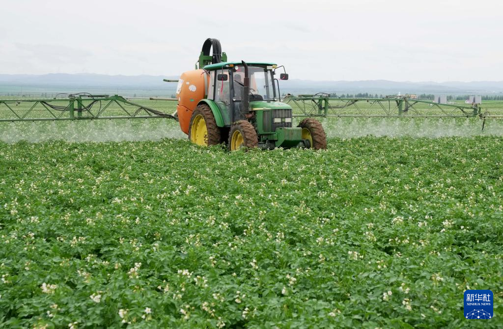 7月15日,农机手驾驶农机在张家口市塞北管理区的田间进行灭虫作业。