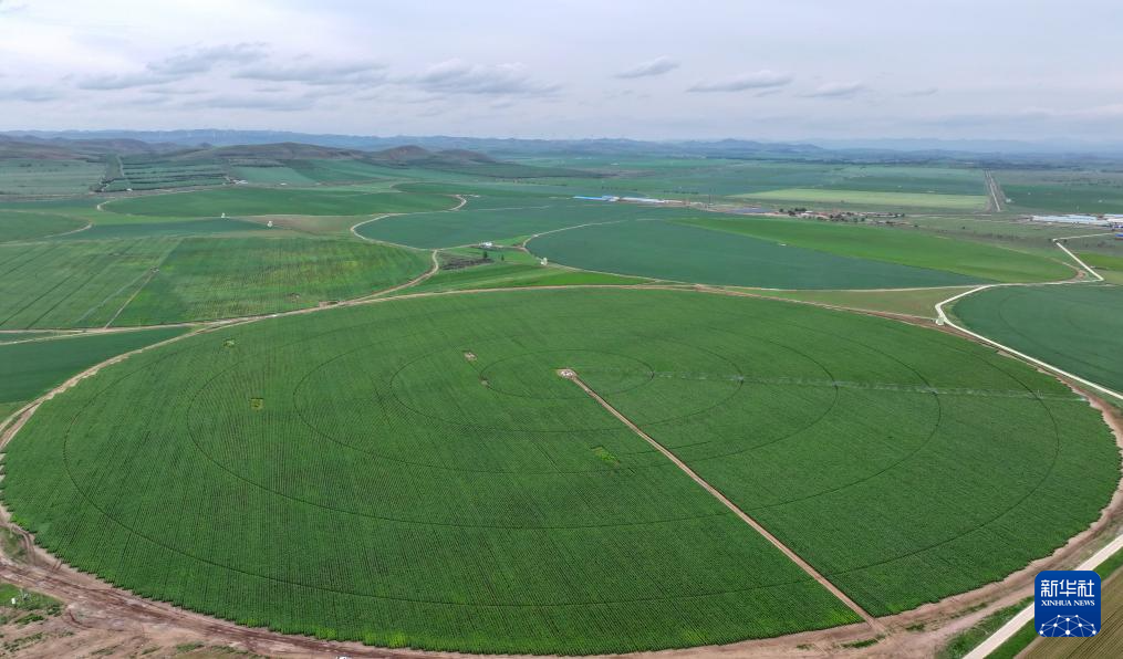 7月15日在张家口市塞北管理区拍摄的装有指针式喷灌设备的农田(无人机照片)。