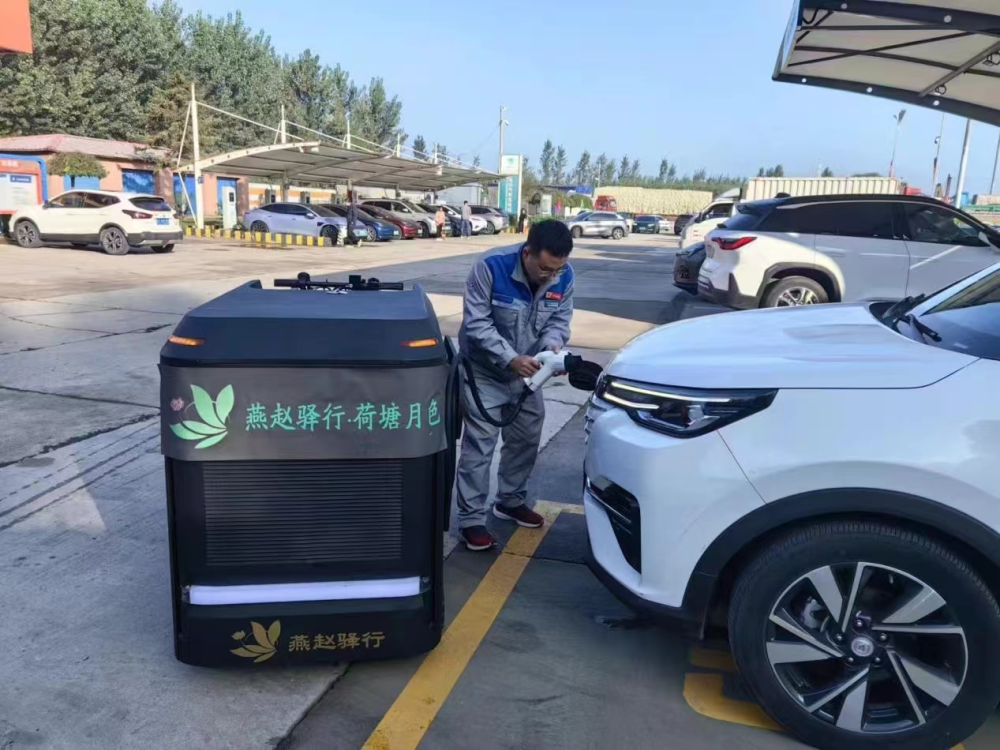 国庆假期期间,为确保司乘人员顺畅出行,河北高速燕赵驿行集团在河北高速山海关、滦州、香河高速服务区投入多台移动充电设备,并组建运维团队,帮助司乘人员正确操作,提供充电保障。(马小蛟 摄)