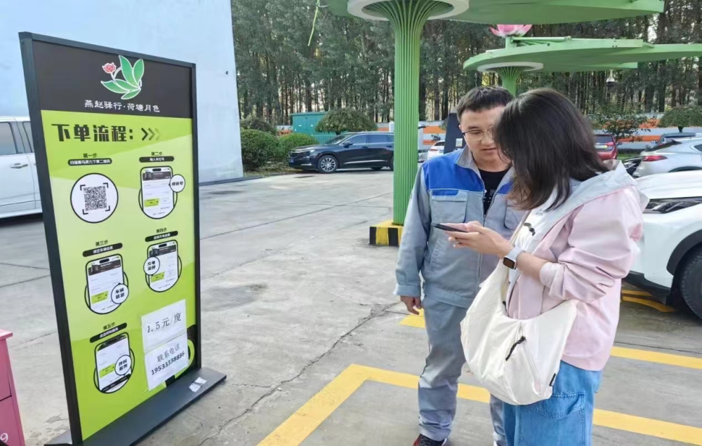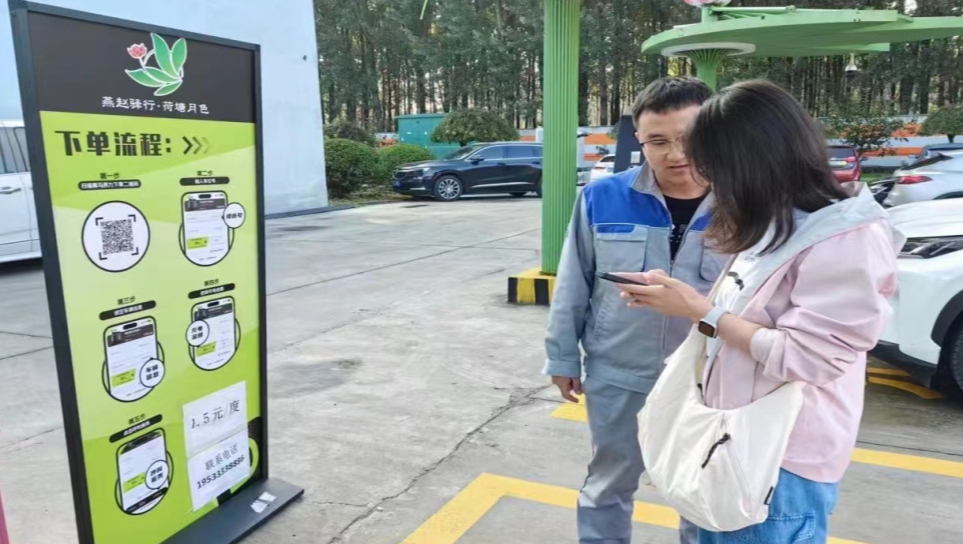 ↑10月1日,滦州高速服务区工作人员指导司乘人员进行移动充电设备下单操作。