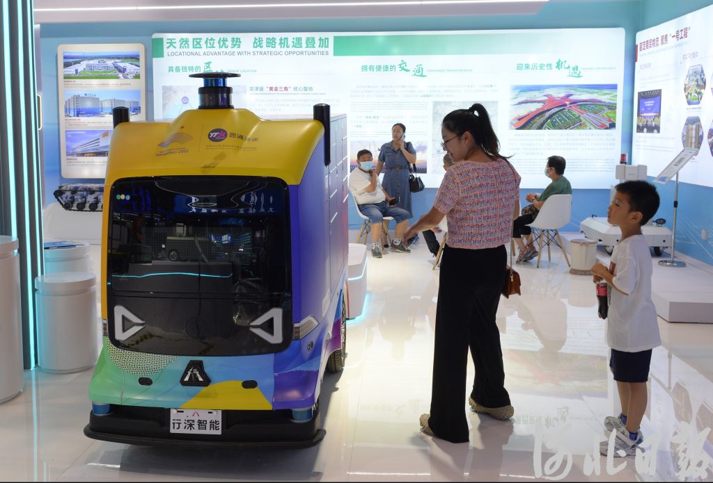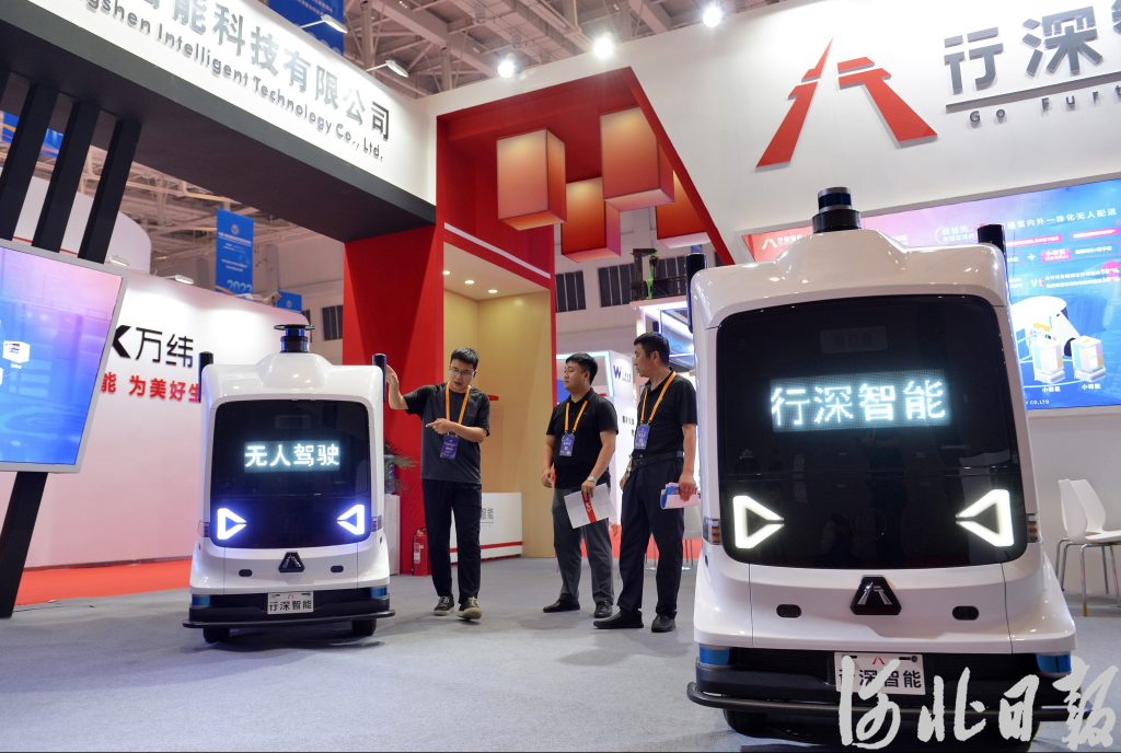 6月17日,在廊坊临空国际会展中心中国(廊坊)跨境电商与智慧物流博览会上,长沙行深智能科技有限公司工作人员向参观者介绍自主研发的智能无人配送车。