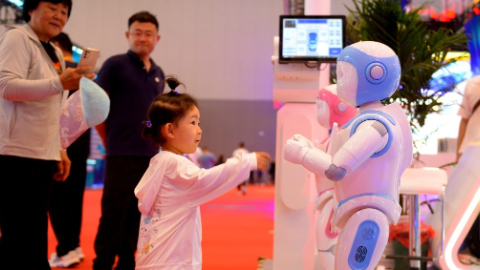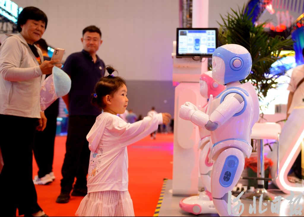 6月18日,在廊坊临空国际会展中心中国(廊坊)跨境电商与智慧物流博览会上,小朋友被一款i宝机器人所吸引。该机器人主要用于陪伴、监护、幼儿编程、课堂助教、学前教育等场景。