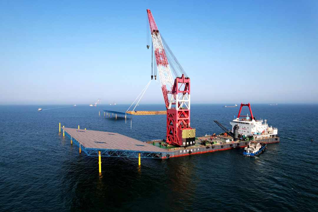 今年5月18日,此项目完成了首榀发电单元的安装,当前建设正酣。项目主要作业区域由陆上拼装场、海上光伏区域、定向钻 海缆敷设、升压站等4部分组成,项目建成后年均发电量可达7.7亿千瓦时,可节约标煤23.1万吨、减排二氧化碳69.5万吨。