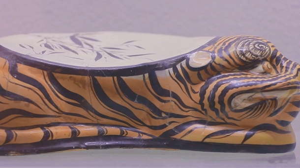 金代器物纹饰中常出现虎、豹、鹿等野兽形象,其中,虎作为百兽之王,历来被看作健壮勇猛的象征和驱邪纳福之祥物。现收藏于黄骅博物馆的磁州窑白地黑花墨竹虎纹枕,呈卧虎形,四肢匍匐,虎背作枕面,绘以墨竹,威严之中有一丝憨态可掬,又添几分灵动文雅。虎纹枕釉面肥厚清亮,黄黑色彩鲜明,尽显东方美学。