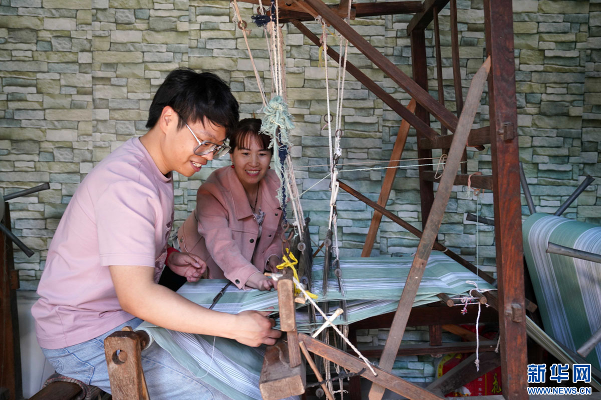 5月1日,河北省沙河市王硇村村民指导游客织布。新华网发 陈雷 摄