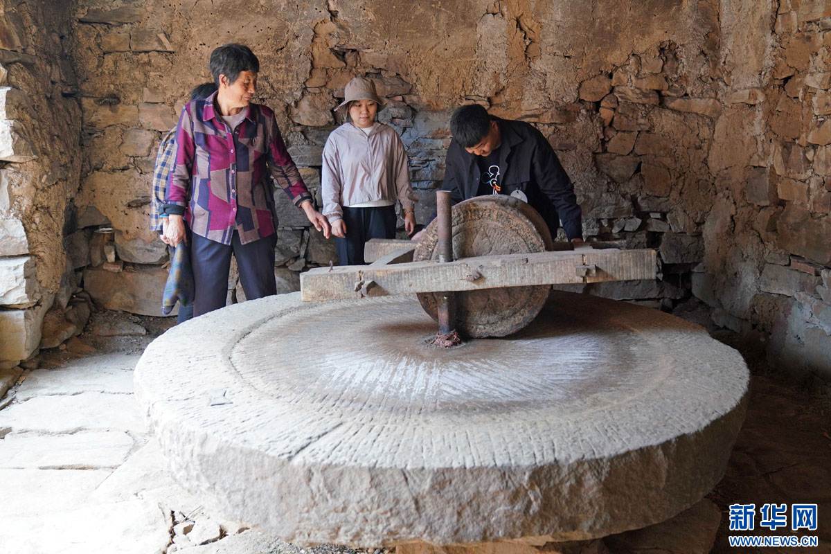 5月1日,河北省沙河市王硇村村民指导游客推碾子。新华网发 陈雷 摄
