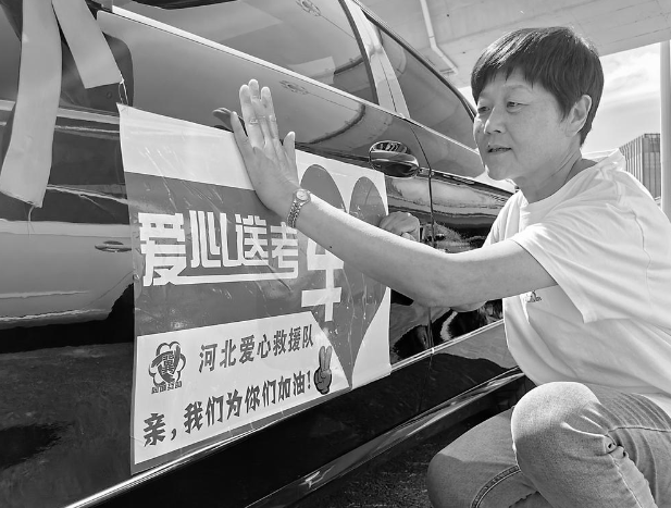 5月31日下午,在体育大街与北三环附近,参加爱心送考的河北爱心救援队几十辆私家车会聚一堂。“河北爱心救援队祝考生金榜题名,加油!加油!加油!”5月31日14时,河北爱心救援队“爱心送考”服务正式启动,排列整齐的爱心送考车前,参加爱心送考服务的队员为高考考生加油祝福。队员们纷纷将“河北爱心救援队送考车”的条幅挂在车头,两侧车门贴有醒目的红色车贴,车两侧后视镜还系有绿丝带。红底白字的车贴上,印着醒目的“爱心送考车”字样,走在路上,很容易辨认。