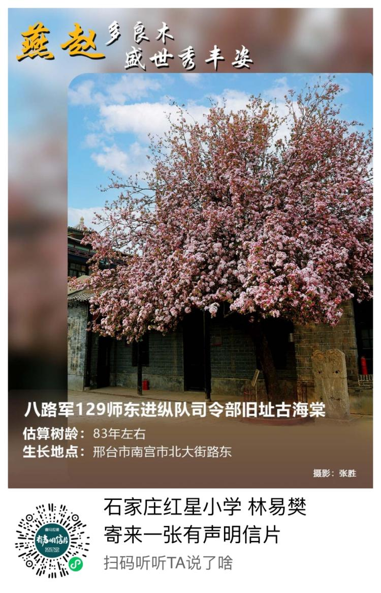 在邢台南宫市八路军129师东进纵队司令部旧址院内,有一棵树龄近百年、树高10米、胸围1.2米、冠幅8米乘7米的古海棠。这棵海棠树历经八十多年风雨,依然生长茂盛。每逢春暖花开时,花朵密密匝匝,成为周边市民的热门打卡地。
