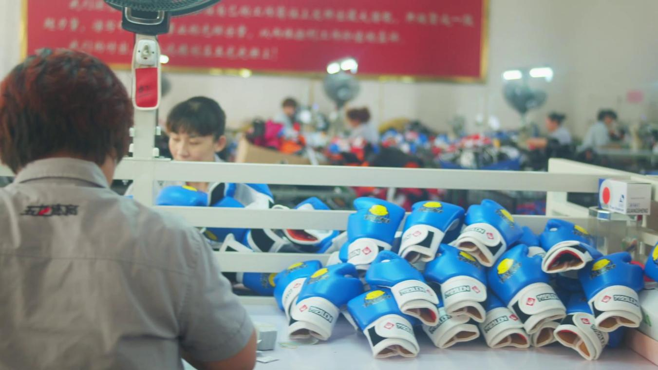 工人在石家庄市五龙体育器材有限公司车间进行皮革加工。无极县政府供图