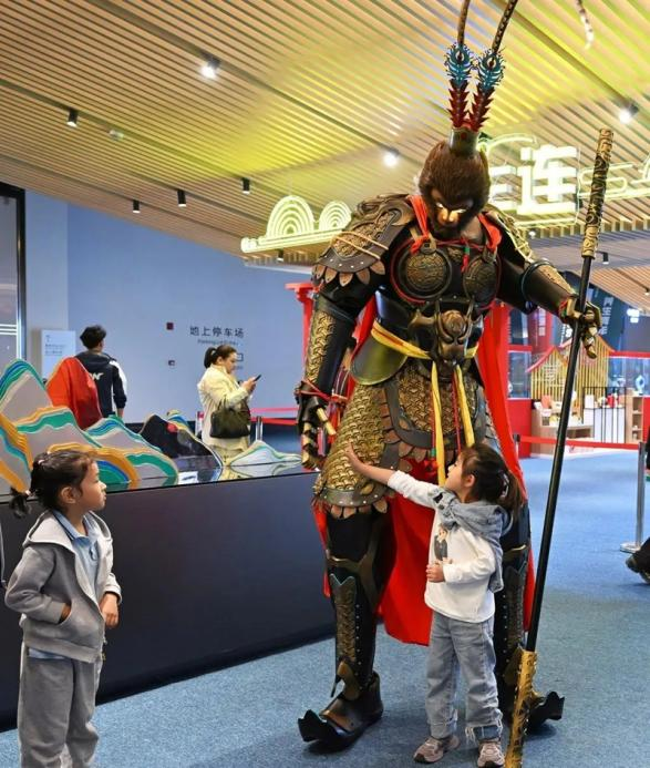 小观众在生活美学市集文创展上与“大圣”互动。图片来源:河北日报