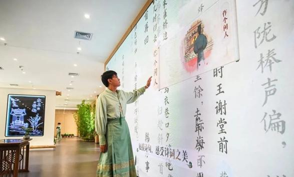 在定州市文体中心“美在定州”研学体验馆,游客通过交互式大屏了解诗词文化。图片来源:河北日报