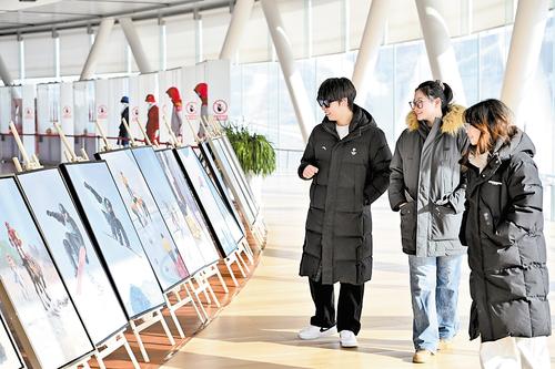 2月3日,游客在“雪如意”顶峰俱乐部欣赏画展。河北日报记者 王伟宏摄