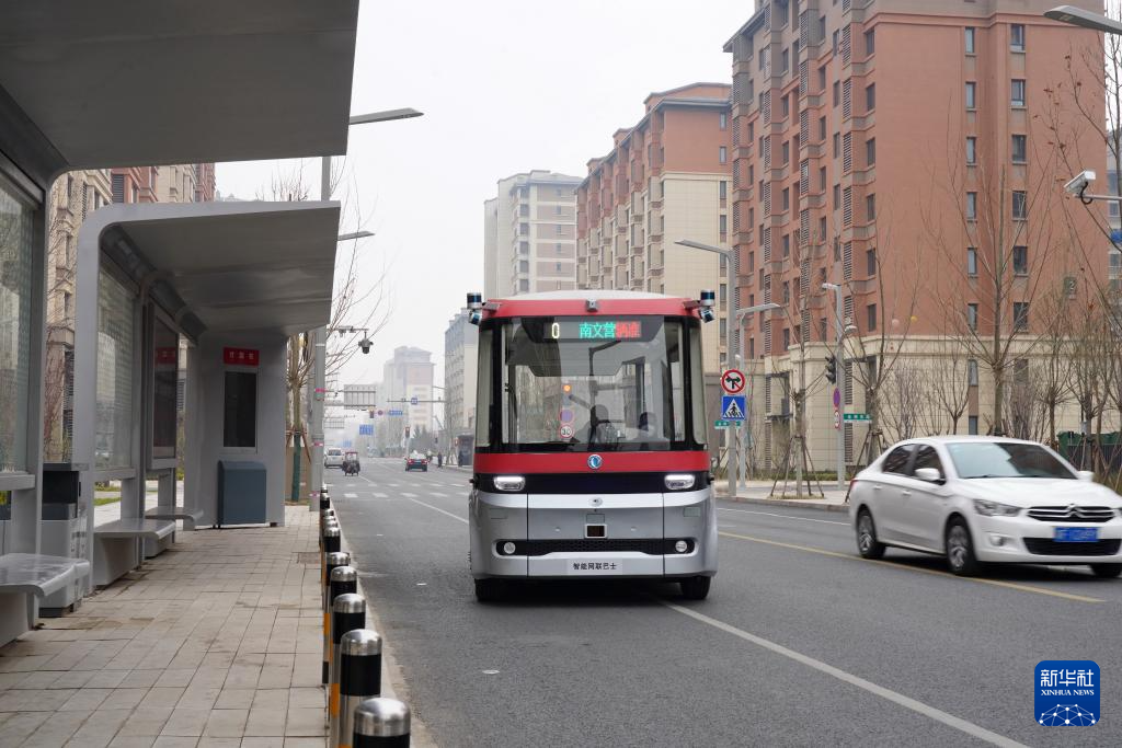 智能网联巴士在雄安新区容东片区道路上行驶。新华社记者 牟宇 摄
