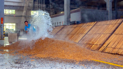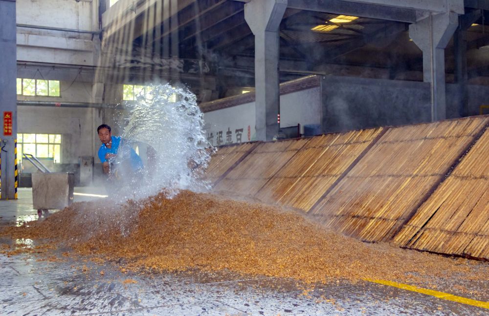↑工人在河北泥坑酒业传统酿造车间作业。(王东方 摄)