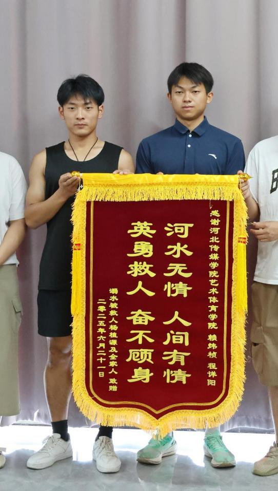 6月19日晚,河北传媒学院鹿泉校区杜北桥附近,艺术体育学院大一学生赖炜桢、程祥阳锻炼返回途中,听见附近的河中传来呼救声。持游泳救生员职业资格证书的赖炜桢果断跳入河中施救。程祥阳则在岸边持照明工具指引方向、随时接应。面对暗流与湿滑河岸,两人凭借专业技能和冷静判断,合力将落水者救起。尽管浑身多处擦伤,他们顾不上处理伤口,立即配合警方展开急救。这一事迹被多家媒体报道,引发强烈反响。