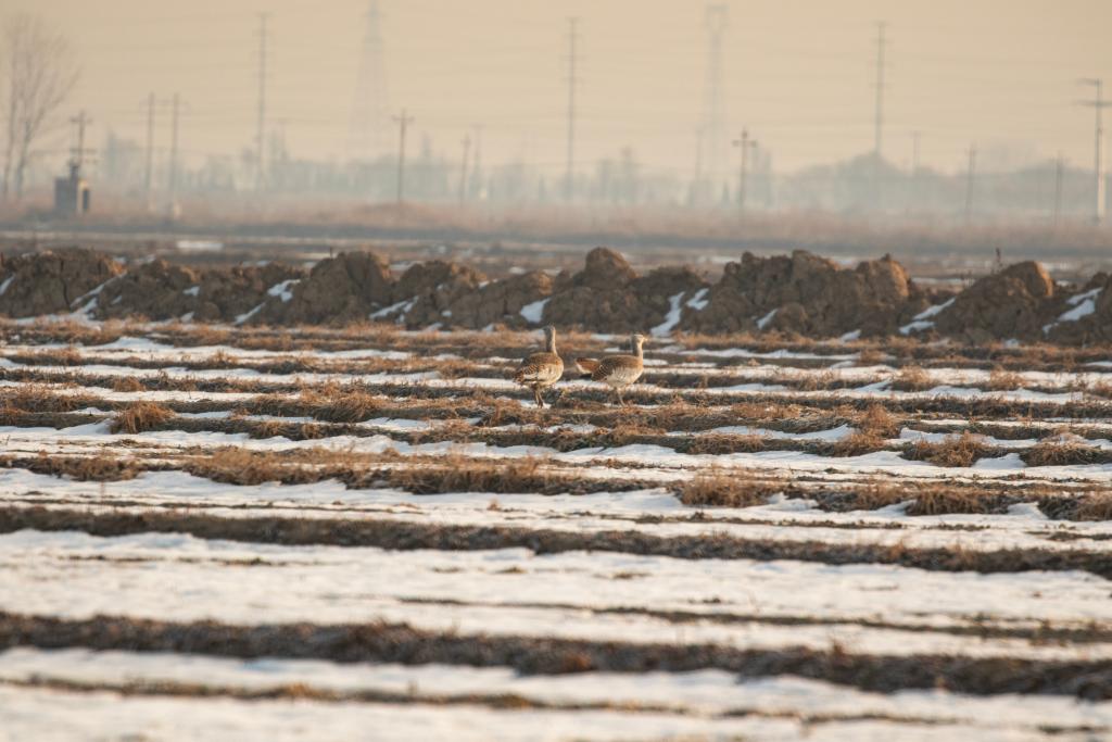 “2000年,衡水湖保护区建立时登统的首期《衡水湖鸟类名录》曾根据之前的观测记录将大鸨纳入其中。但此后大鸨身影鲜见,工作人员仅在2020年观测记录到1只。然而,在2024年1月8日上午,调查人员惊喜地发现了5只大鸨正在衡水湖北侧农田中觅食。”张余广说。