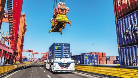 千米之外,吊具对准船上集装箱的锁扣,稳稳地将集装箱放置到新一代重型智能平板运输车上,无人驾驶的运输车随后自动驶向堆场,整个过程行云流水。