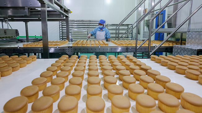 河北马大姐食品有限公司烘焙车间内,工人正在摆放蛋糕。定兴县供图