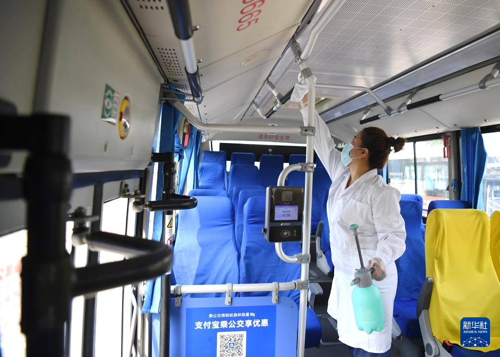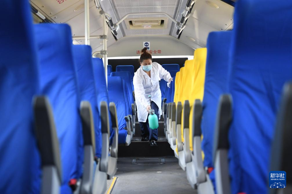 8月9日,河北省涿州市838路公交总站工作人员对车辆进行消毒。