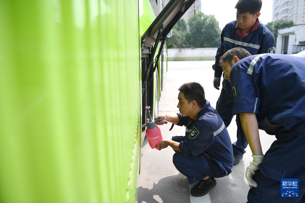 8月9日,河北省涿州市838路公交总站工作人员对车辆进行养护。