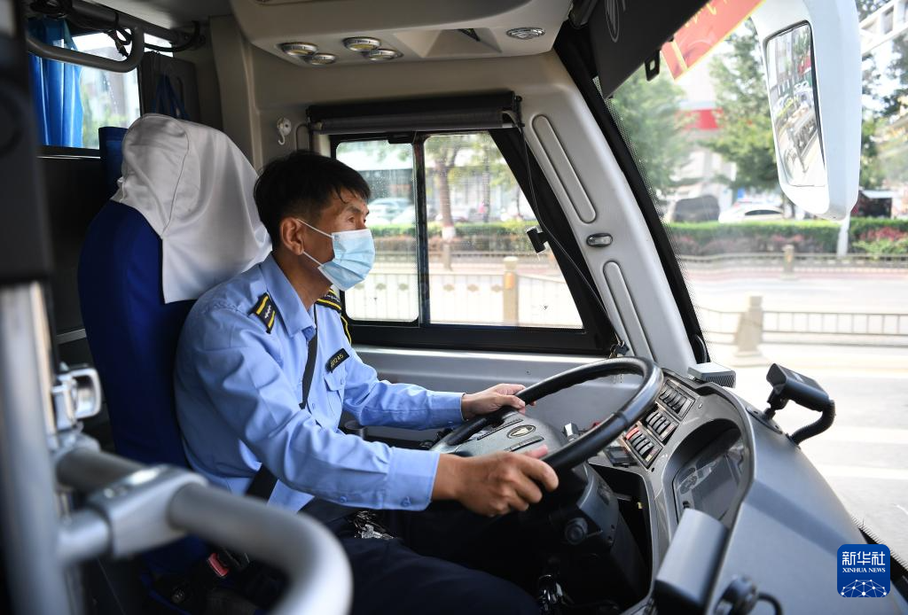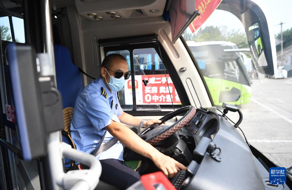 8月9日,在河北省涿州市838路公交总站,司机调试车辆准备发车。