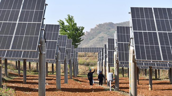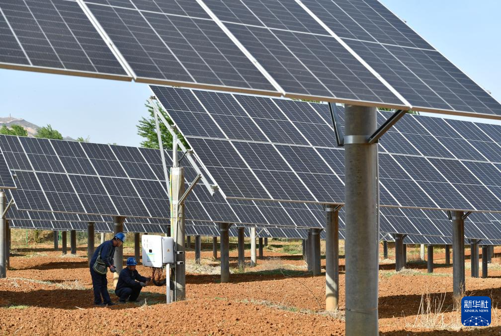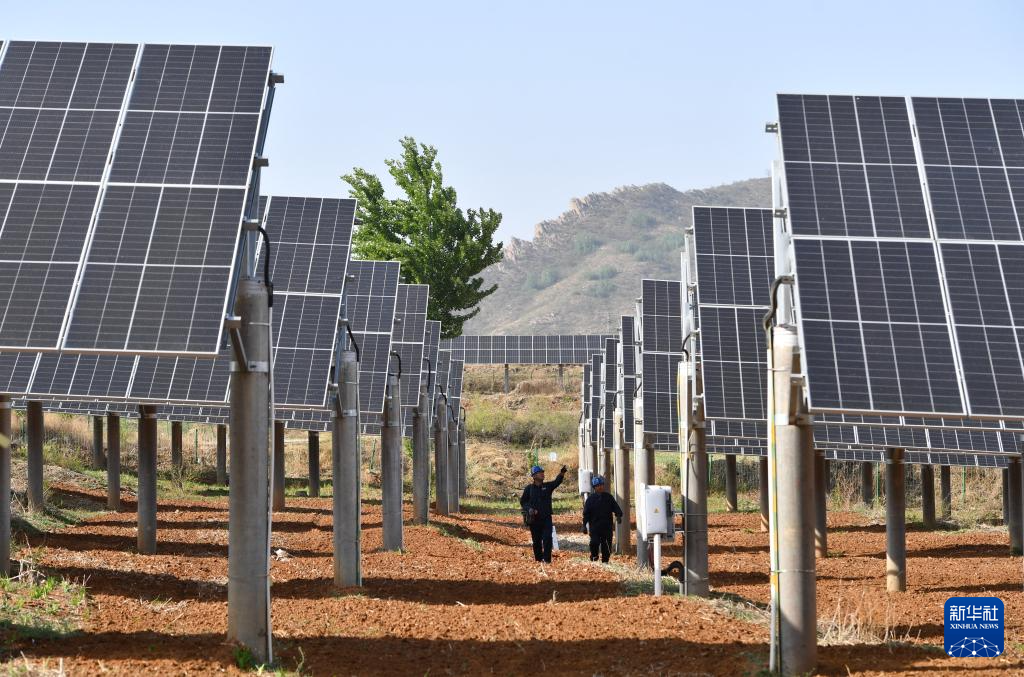 4月16日,工人在河北省石家庄市灵寿县谭庄乡程家庄村的“农光互补”光伏发电场检查输电设备。