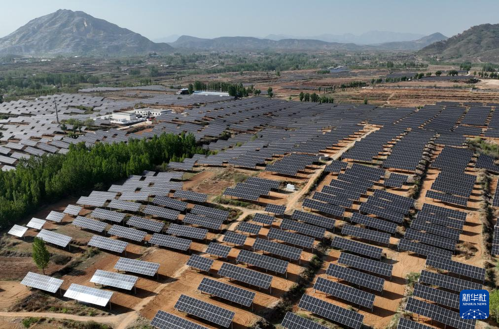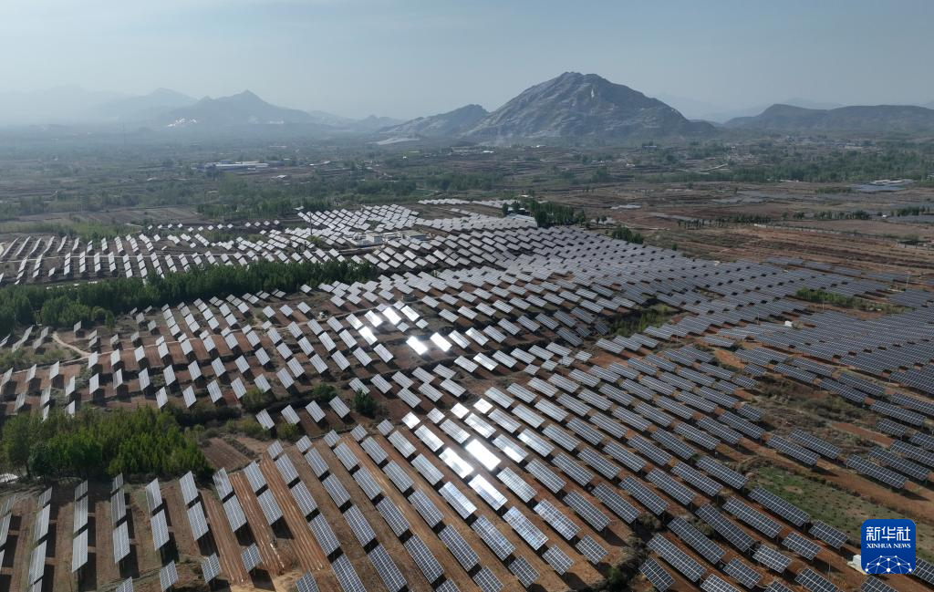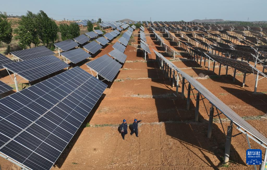 4月16日拍摄的河北省石家庄市灵寿县谭庄乡程家庄村的“农光互补”光伏发电场(无人机照片)。