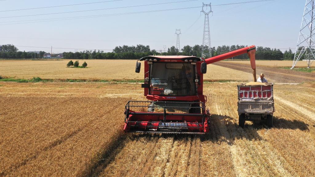 农机手驾驶联合收割机在永年区刘营村刘军的麦田中收割小麦。新华社记者 赵鸿宇 摄
