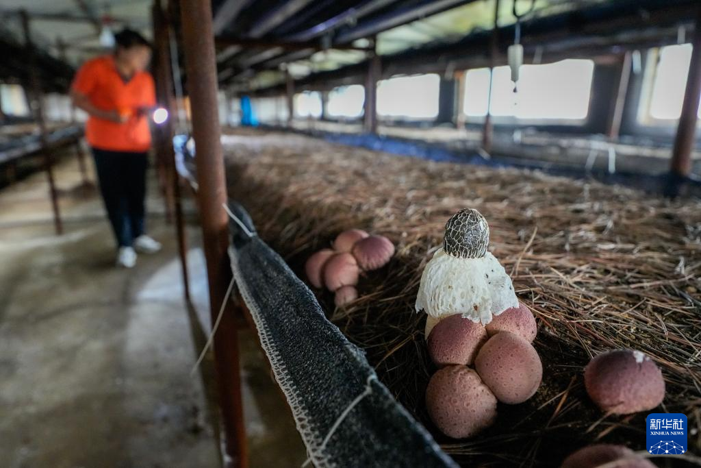 9月2日,农民在河北省迁西县三屯营镇六宝峪村食用菌种植基地查看竹荪长势。