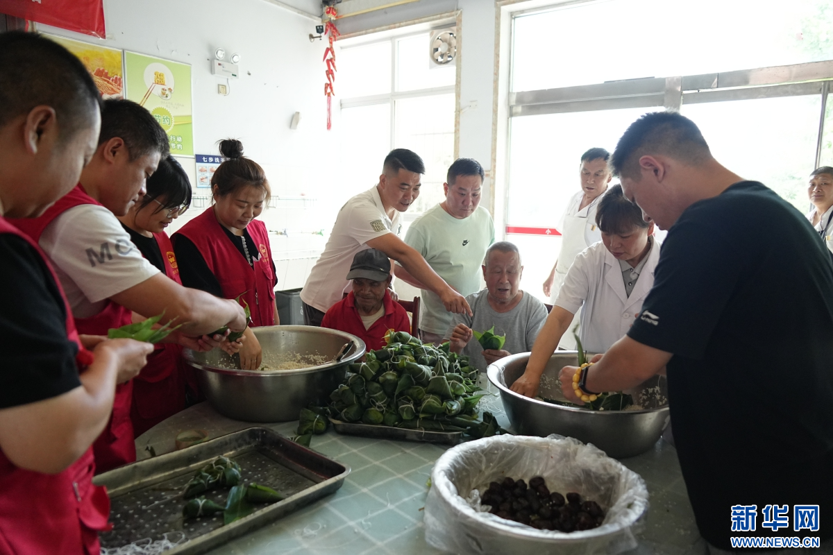 志愿者和老人们一起包粽子。新华网发