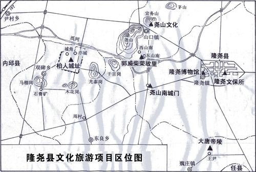 隆尧县是远古人类重要活动区域之一,经考古发现,在尧山附近的汦河两岸有仰韶文化(后冈类型)遗存三处(西山南遗址、西侯南遗址、北村东遗址),距今6000多年。北小霍村南一公里处曾出土石器、陶器,经鉴定属龙山文化。1954年在丘底村南发现的地下夯土墙、石凿以及在双碑一带出土的绳文陶鬲等,均系这一时期的遗存。公元前2000年相当于父系氏的公社时期,传说中的黄帝后裔氏族部落三大领袖尧、舜、禹曾在这一带活动,境内宣务山(又名尧山)即为唐帝尧的采封之地。尧曾于此治理天下,繁衍生民凡70载。县北固城东一里许为古象氏城址,相传舜弟象曾居此。春秋晋国时,在宣务山西筑柏人城。汉时,又置柏人、广阿、象氏三县。历经数千年的历史沿革,地上地下留有许多高品位的文物古迹,成为文物大县。