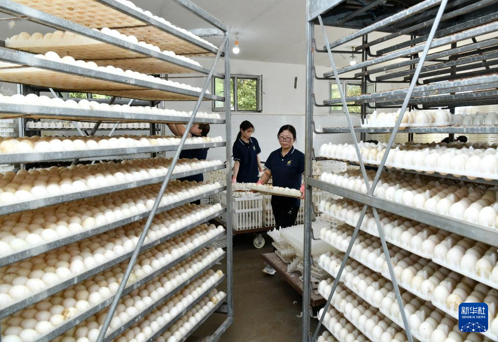 5月23日,河北省献县一家“z型北京鸭”养殖企业的工人在种蛋分拣车间工作。