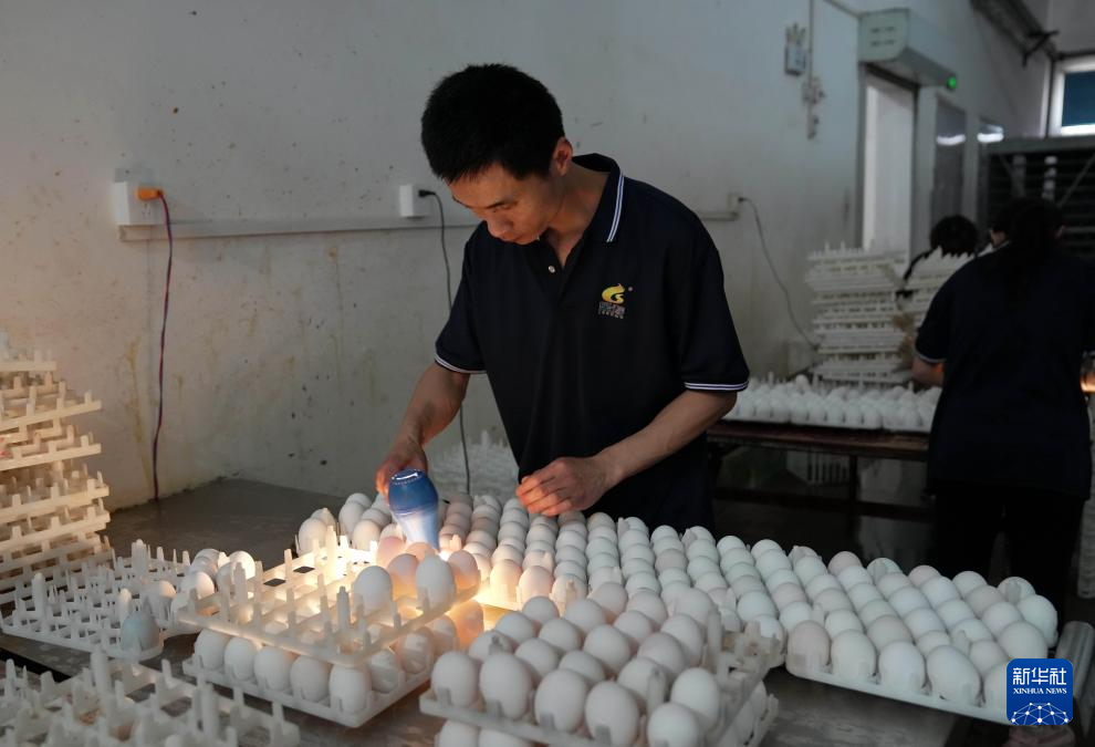 5月23日,河北省献县一家“z型北京鸭”养殖企业的工人在孵化车间检查种蛋胚胎发育情况。