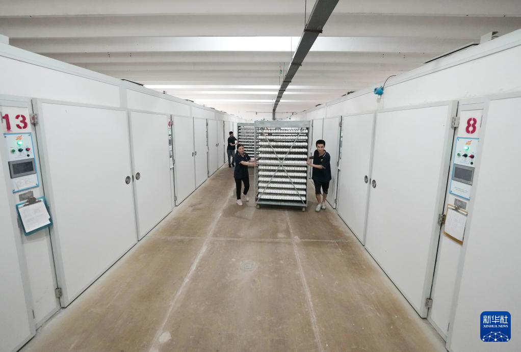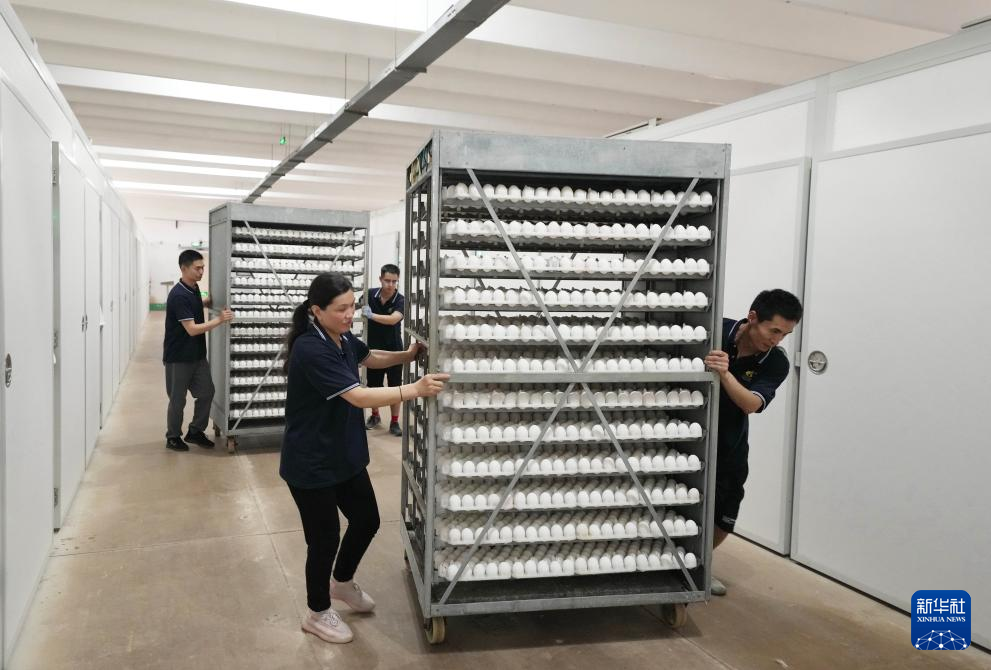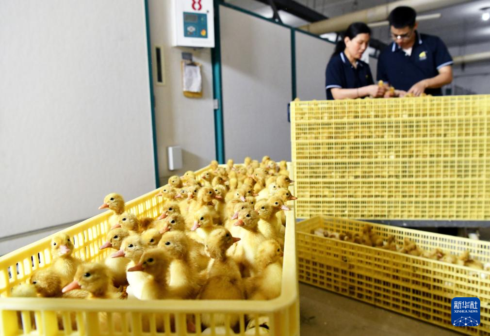 5月23日,河北省献县一家“z型北京鸭”养殖企业的工人在孵化车间工作。